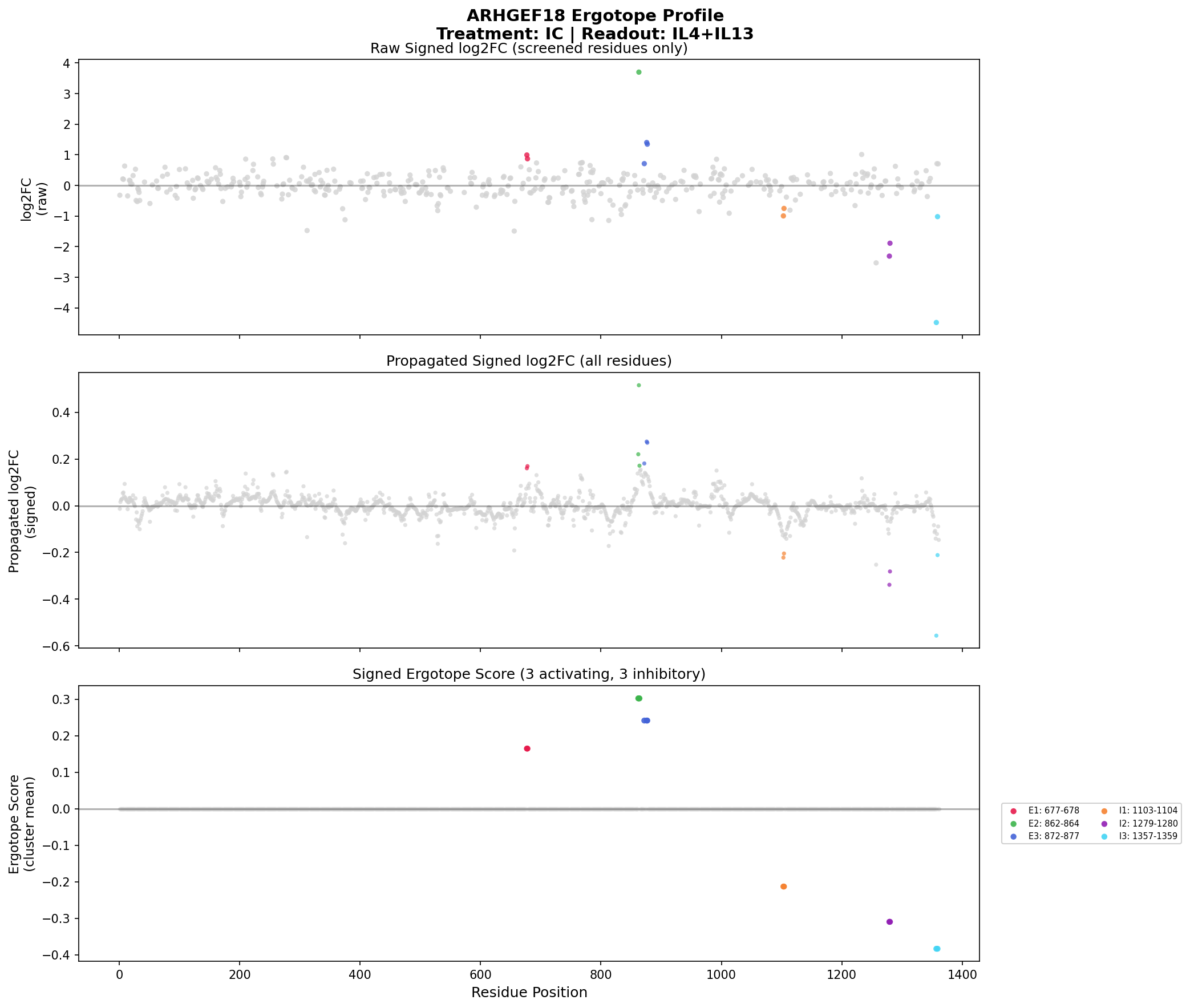 Ergotope scores along the protein sequence. Negative scores = inhibitory (drug would inhibit), Positive scores = activating (drug would activate).