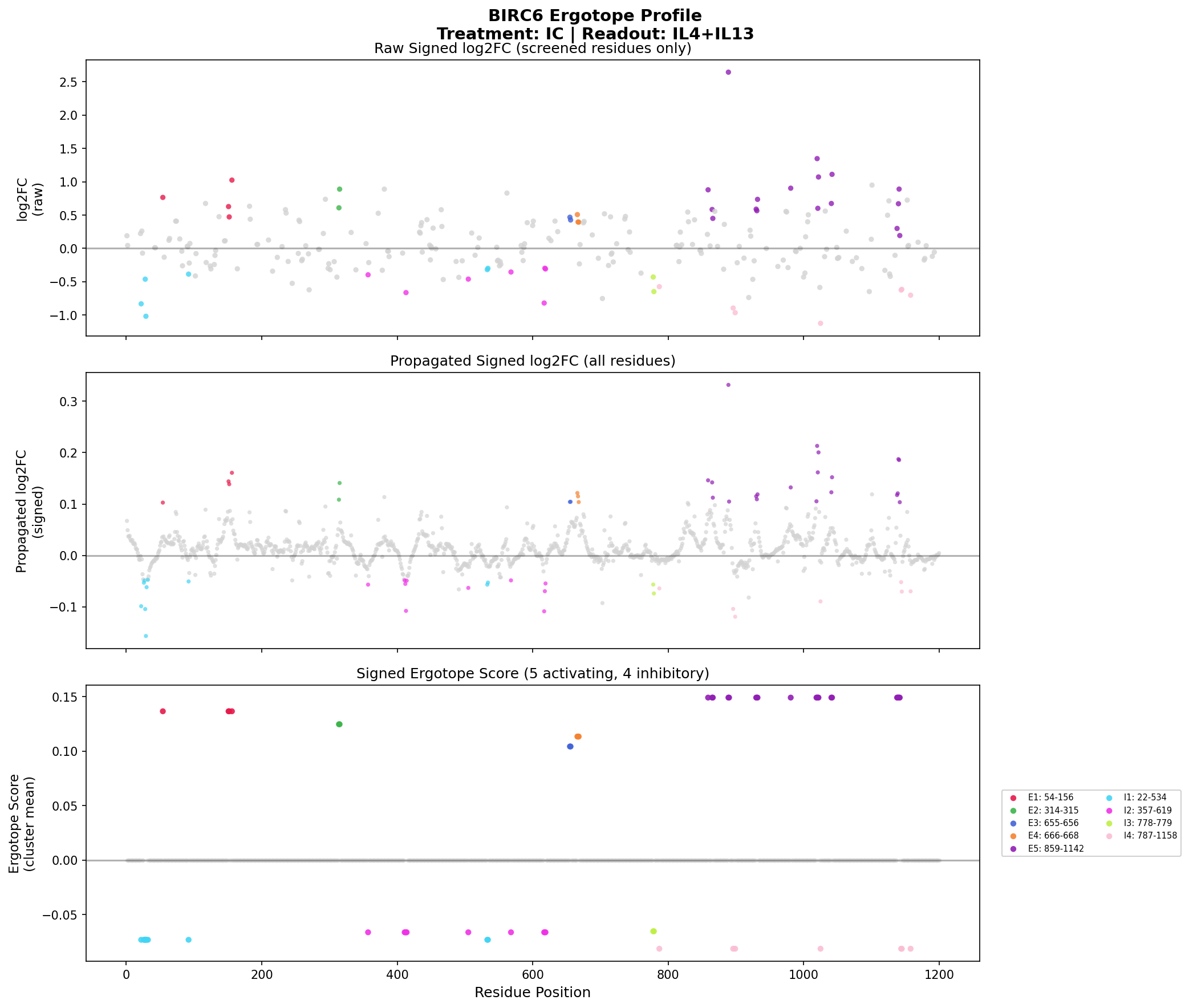 Ergotope scores along the protein sequence. Negative scores = inhibitory (drug would inhibit), Positive scores = activating (drug would activate).