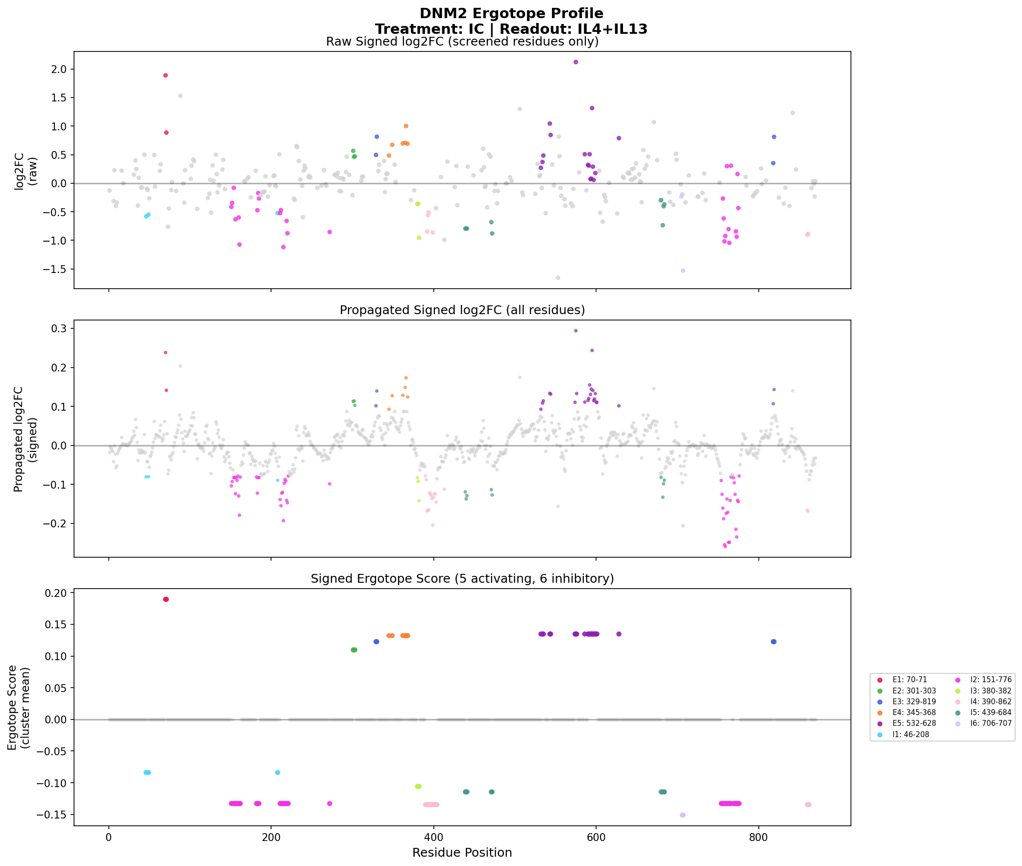 Ergotope scores along the protein sequence. Negative scores = inhibitory (drug would inhibit), Positive scores = activating (drug would activate).