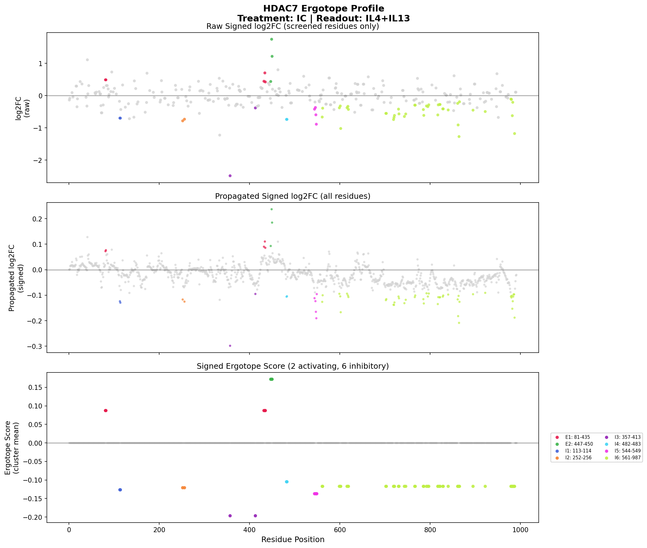 Ergotope scores along the protein sequence. Negative scores = inhibitory (drug would inhibit), Positive scores = activating (drug would activate).