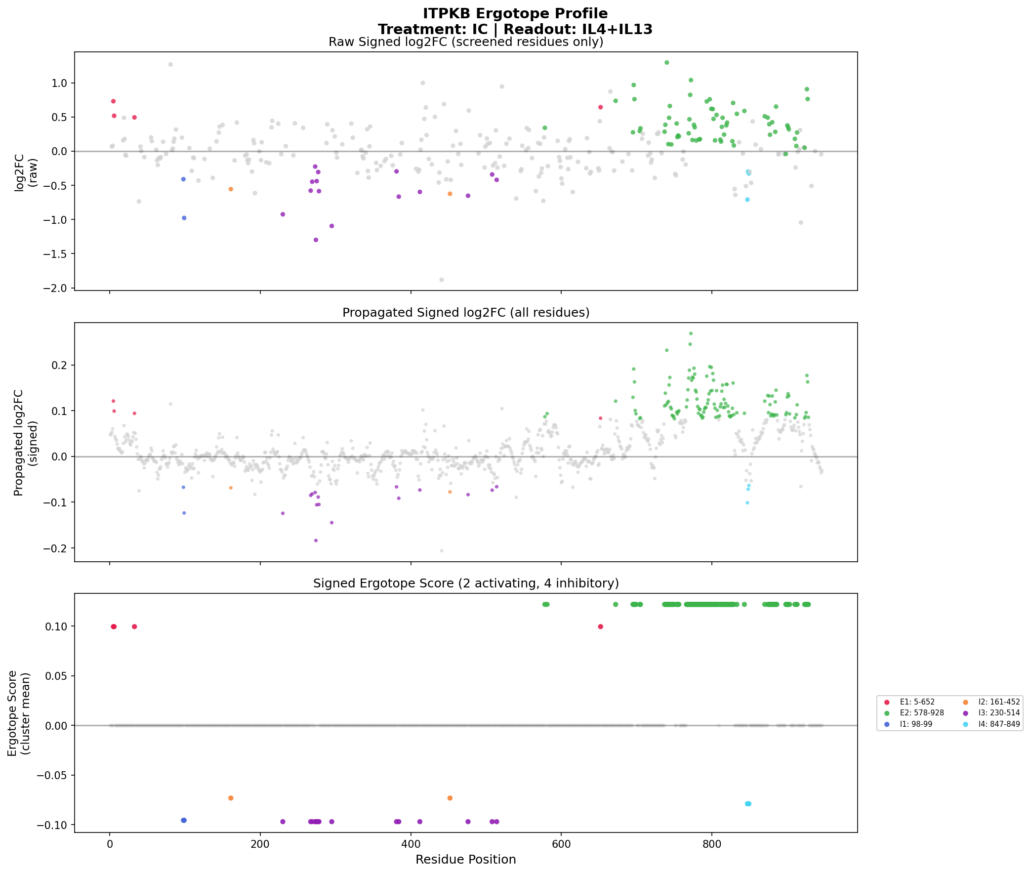 Ergotope scores along the protein sequence. Negative scores = inhibitory (drug would inhibit), Positive scores = activating (drug would activate).