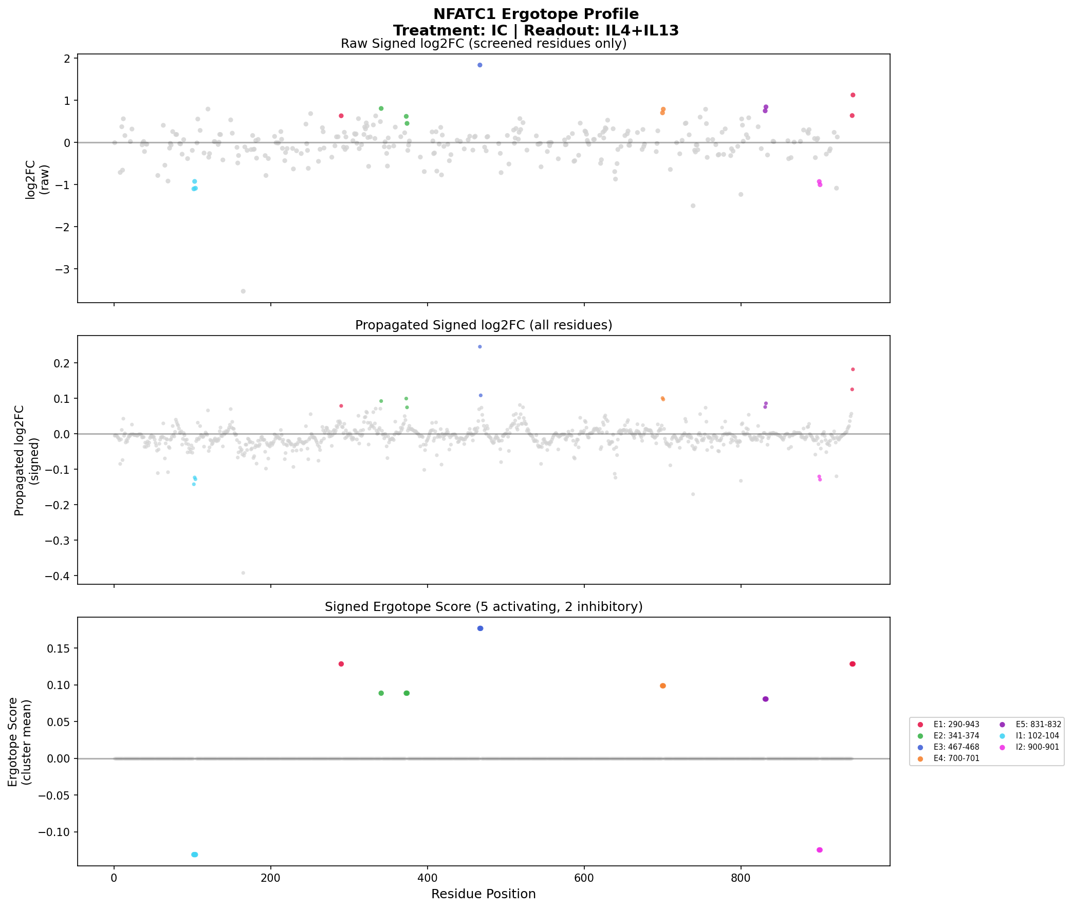 Ergotope scores along the protein sequence. Negative scores = inhibitory (drug would inhibit), Positive scores = activating (drug would activate).