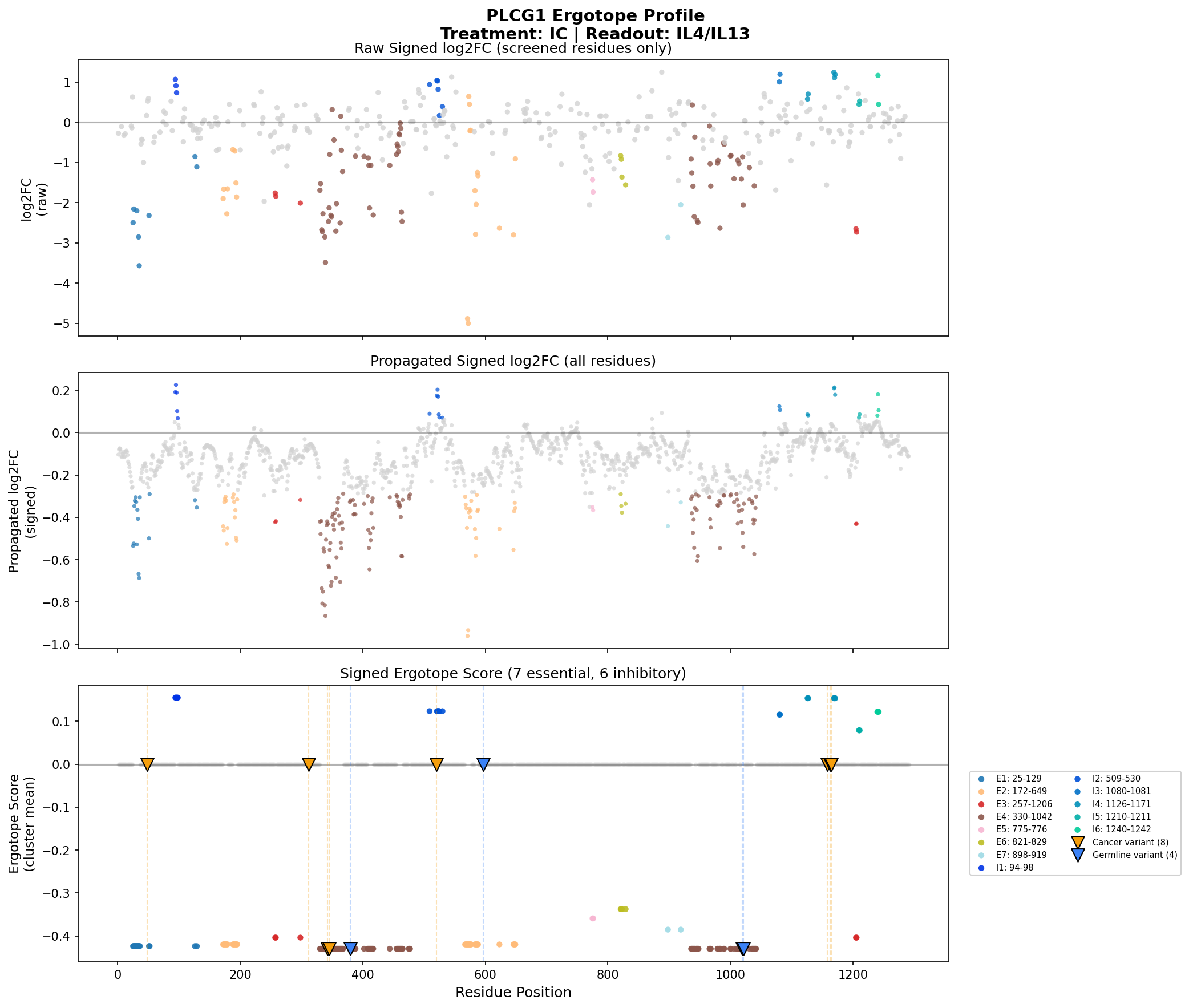 Ergotope scores along the protein sequence. Negative scores = inhibitory (drug would inhibit), Positive scores = activating (drug would activate).