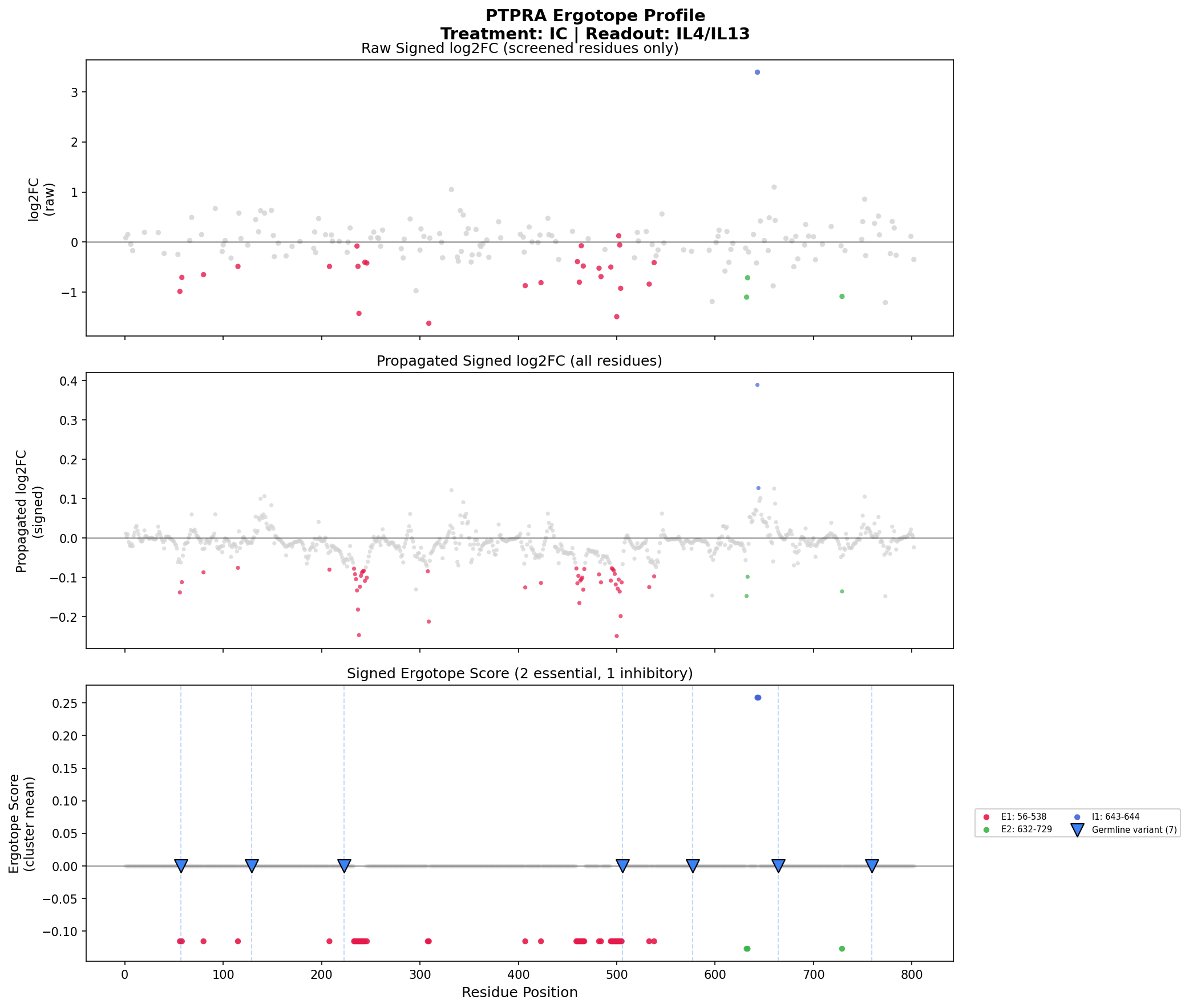 Ergotope scores along the protein sequence. Negative scores = inhibitory (drug would inhibit), Positive scores = activating (drug would activate).